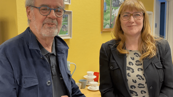 Bo R Holmberg pratar här om utställningen med Kristina Stålnacke som till en del varit med om att arrangeras utställningen. Foto Sven Lindblom.