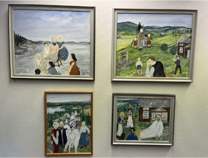 Här berättar Alda Boström om Mästaren från Järvberget som får sina fötter tvättade av kvinnorna. En tavla visar när han predikar och en bonde hytter med näven när han förlorar sin hustru till sekten. En tavla visar hur Mästaren drar vidare omgiven av kvinnor och slutligen hur de klär honom i vitt på bilden nere till höger.. Foto Sven Lndblom